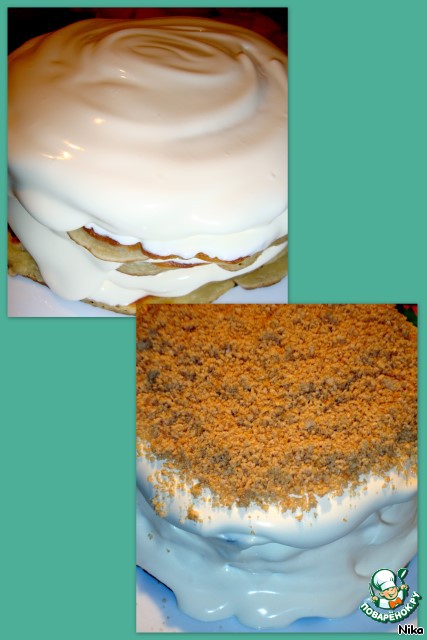 Каждый блин намазала белыми сливками. Верх и бока посыпала тёртыми вафлями.