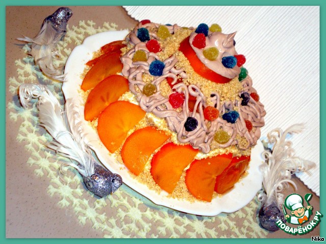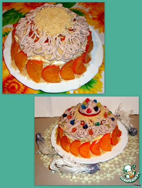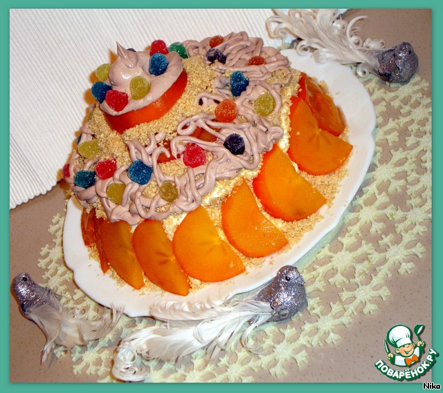 Половинки хурмы выложила по бокам тортика и сверху. Затем кофейный крем - сливки выдавила из бумажного пакетика и разложила конфеты.