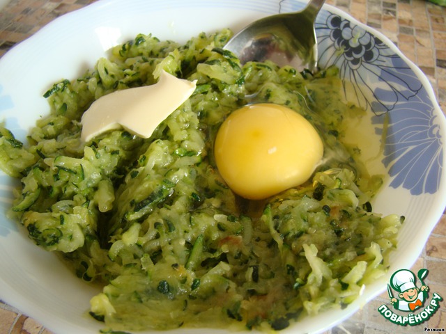 В готовые кабачки добавьте два яйца, сливочное масло и все перемешайте.
