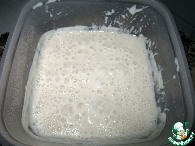 В глубокой емкости развести дрожжи кислым молоком, добавить 1 ст. л. сахара. Когда дрожжи разойдутся, добавить муку, размешать до однородности, закрыть крышкой и отправить в холодильник на 12 и более часов. Так выглядит тесто через 12 часов.