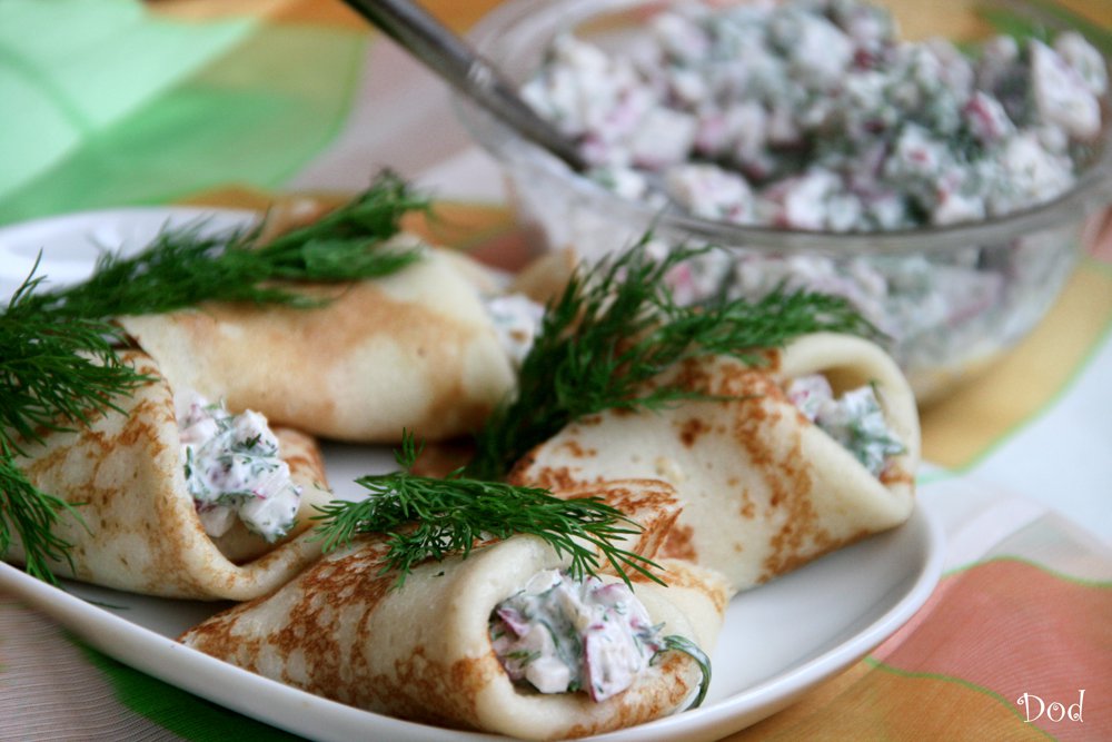 | Редис прекрасно сочетается с зеленью и молочными продуктами. Блины с такой заправкой имеют очень оригинальный и свежий вкус. Масленица приносит свои плоды. |