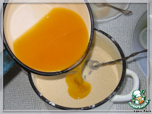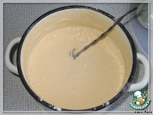 3 раз подошло - готово. Добавляем стакан горячего молока (не перелить, тесто должно стекать в половника, не капать, но и не быть водой), добавляем взбитые в крутую пену белки и 2 столовые ложки подсолнечного масла.