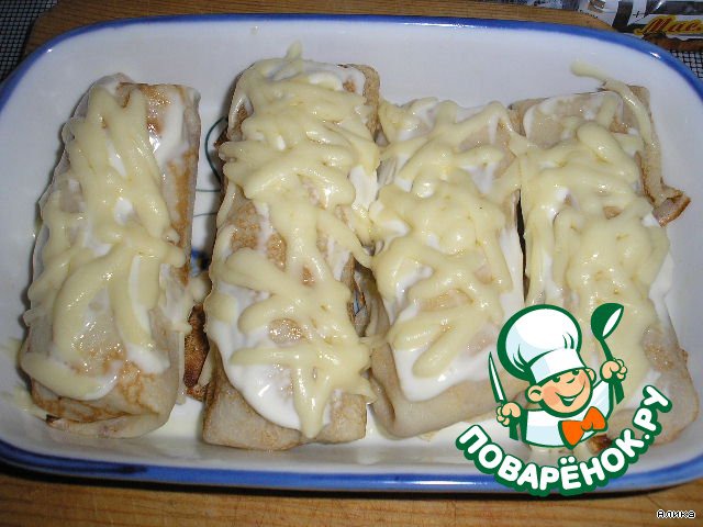Выкладываем фаршированные блинчики в форму для запекания, предварительно смазанную сливочным маслом. Каждый блинчик сверху смазываем 1 ч.ложкой майонеза или сметаны, посыпаем сыром и отправляем в разогретую до 180°С духовку до расплавления сыра минут на 5.