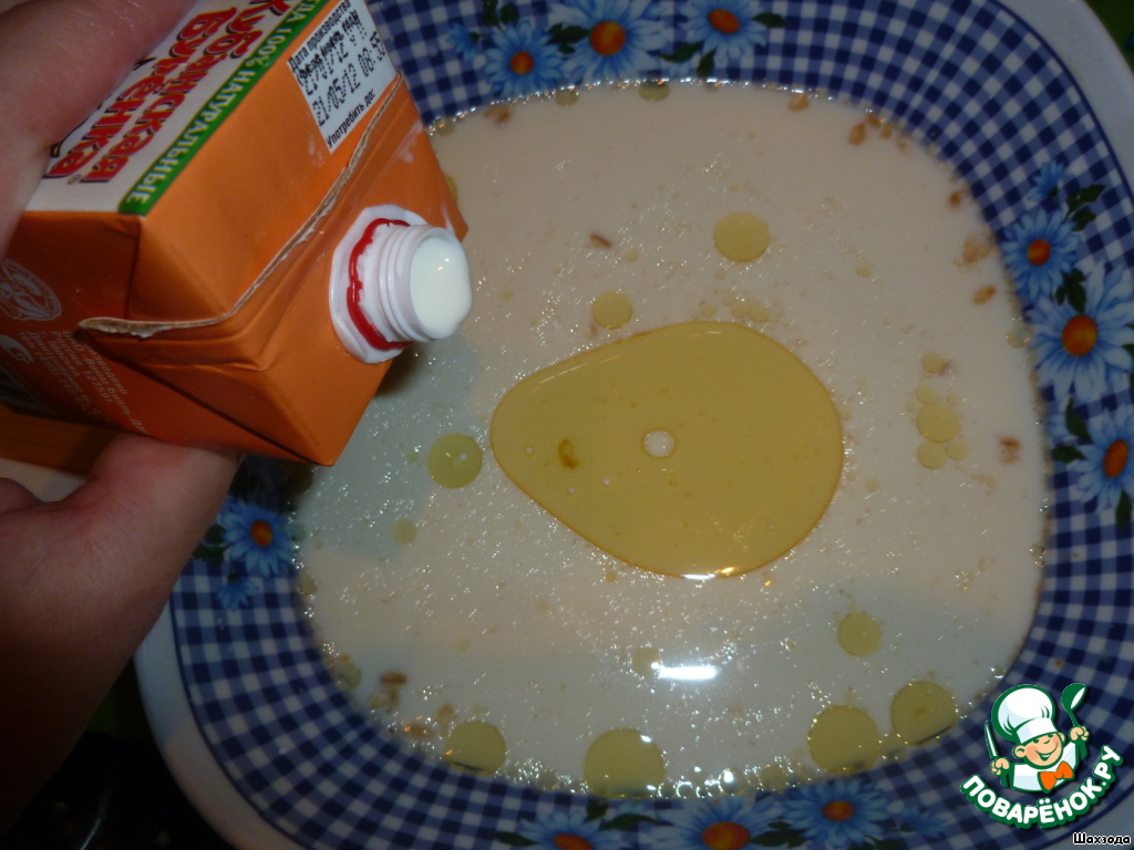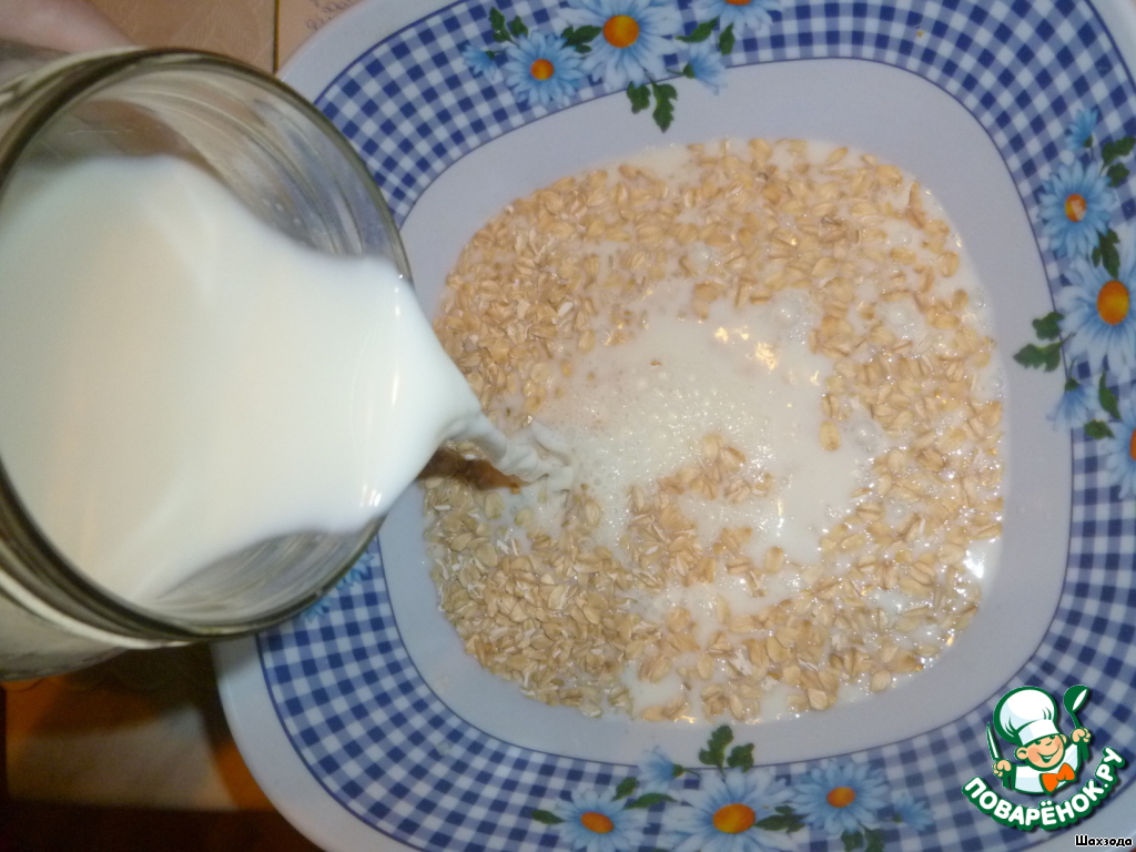В овсяные хлопья влить заранее подогретое горячее молоко
