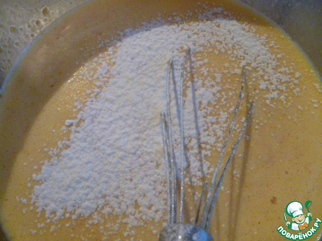 Затем аккуратно ввести просеянную муку, хорошо перемешать.
