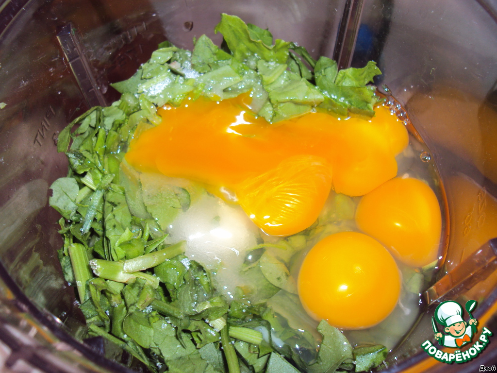 Укладываем в блендер (или можно пропустить через мясорубку) щавель, яйца, сахар, крахмал и взбиваем всё хорошенько до однородной массы