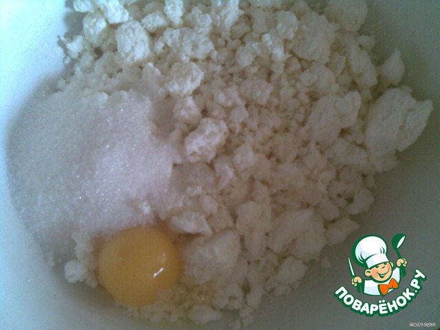 Делаем начинку.Для этого смешиваем творог,яйцо,2 ч.л сметаны,сахар,можно добавить изюм и ванилин.