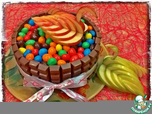 Теперь приступаем к украшению. Лучше если кто-то вам поможет подержать шоколад. Я делала одна, поэтому шоколад все время норовил упасть. Я его ставила немного под наклоном к центру тортика, а затем уже лентой сдавила и выровняла. Шоколада у меня ушло 4 упаковки большие, там где по 8 шт. При открытии некоторые были поломаны сразу, поэтому лучше чтоб шоколад был в запасе. Когда ленточкой обмотаете, сверху на наш тортик выложите массу из обрезанных панкейков, тем самым выравнивая поверхность. Конфеты я сразу не выкладывала, тортик поставила на балкон для пропитки и полного застывания крема. Через два часа мне пришлось уже доставать и украшать, так как сын уже должен был вернуться с садика. Но лучше конечно подождать часа четыре. Сверху выложить конфетки Ммдемс. Для деток добавила пару лебедей из яблочек.