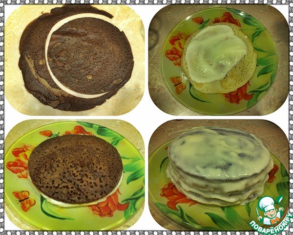 Несколько получившихся больших панкейков я обрезала по диаметру, соответствующему остальным панкейкам, а обрезки использовала в дальнейшем (далее увидите). Начинаем собирать мини тортик. Чередуем белый и коричневый панкейк, смазывая тщательно каждый слой остывшим кремом. Бока тоже необходимо промазать.