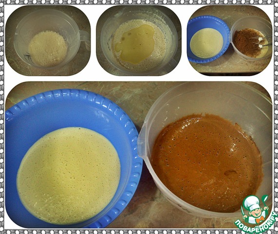 Приготовим тесто для панкейков. Яйца взбить с сахаром и солью до появления пенки. Добавить стакан молока и просеянный стакан муки, взбить. Затем опять добавляем стакан молока и просеянный стакан муки, взбить. Далее вливаем растительное масло, соду (гашеную) и все перемешаваем. Получившееся тесто делим на две части и в одну из них добавляем какао. (Перемешивать тесто нужно до того момента, пока влажные и сухие компоненты не объединятся. Если вы перестараетесь, мука начнет развивать клейковину, и в итоге вы получите резиновые блины, а не пушистые панкейки).