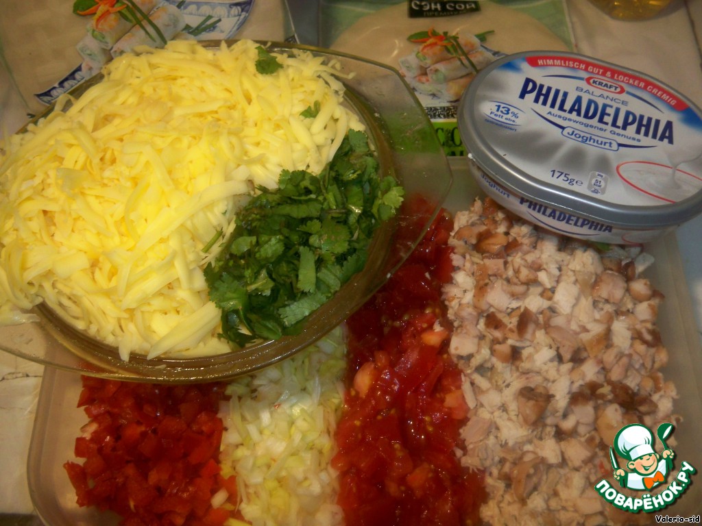 Четверть листа смазываю сыром "филадельфия" и кладу начинку. Нужно класть немного, чтобы лист не порвался.
