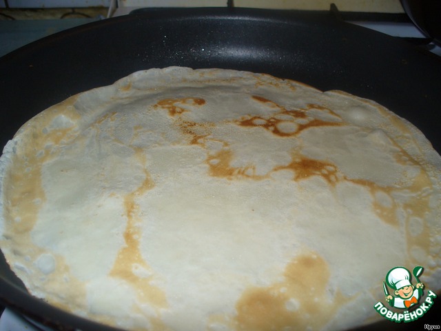 Сначала выпекаем тонкие блинчики большого диаметра. По любому рецепту.