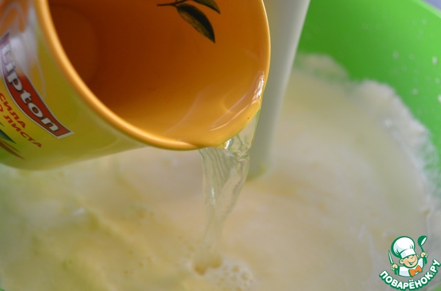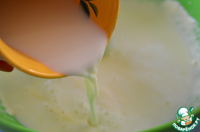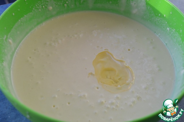 Перемешиваем и добавляем понемногу муку. Консистенция должна быть чуть гуще, чем на обычные блины, но не такая густая, как на оладьи.