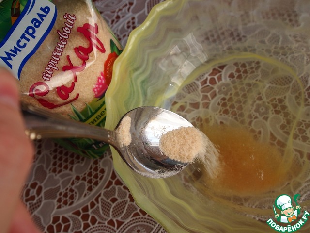 Приготовим тесто на блины. Для этого выльем в емкость воду комнатной температуры и добавим коричневый сахар. Перемешать, чтобы сахар растворился.