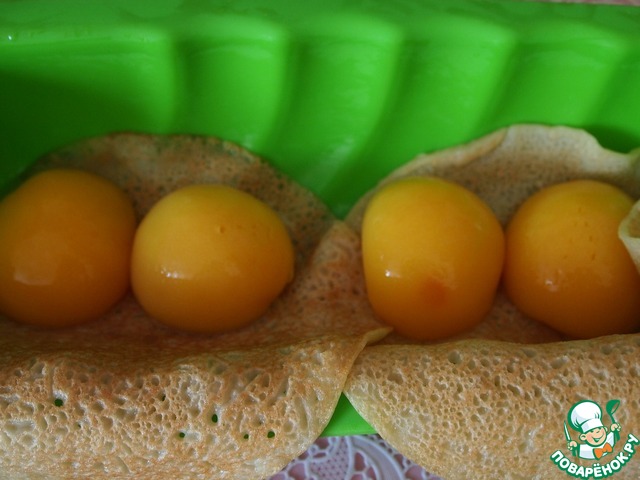 Открыть банку с персиками, отдельно слить персиковый сироп, он нам еще пригодится. Блинчики выложить в форму, смазать персиковым сиропом.