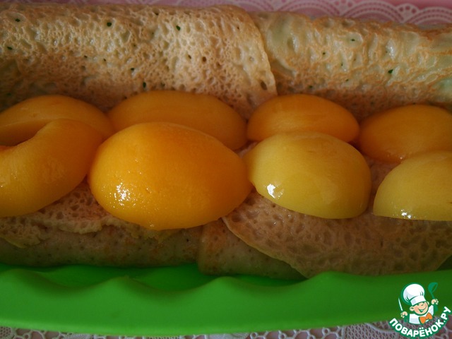 Накрыть персики блинчиками, сверху выложить еще блинчики, смазывая каждый персиковым сиропом.