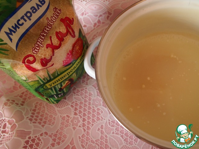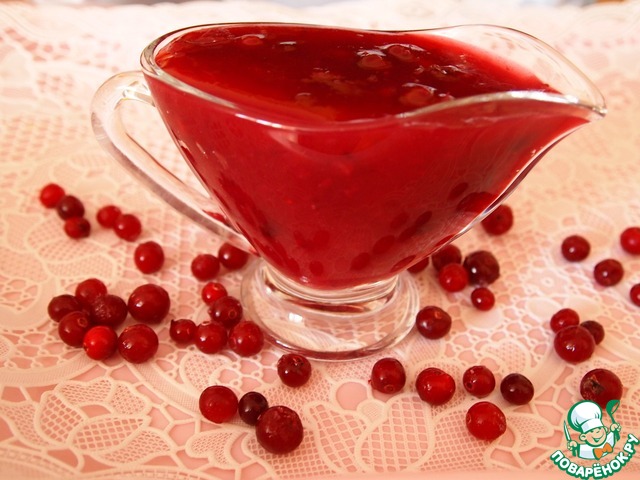 Тем временем приготовим клюквенный соус. Для этого оставшийся персиковый сироп (примерно 1 стакан) вылить в кастрюльку, добавить коричневый сахар.
