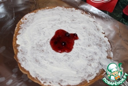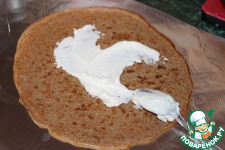 Формируем рулет, для этого расстилаем фольгу или плёнку на стол, смазываем каждый блинчик творожной начинкой.