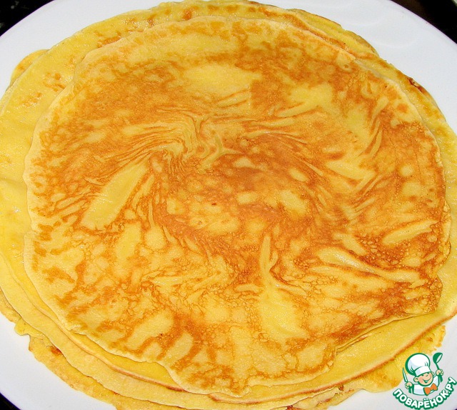 Жарим тонкие блины по диаметру сковороды ( 28 см ). Сковороду нагреть, но смазывать маслом не надо. Последний блин получился немного меньше. Всего 6 блинов.