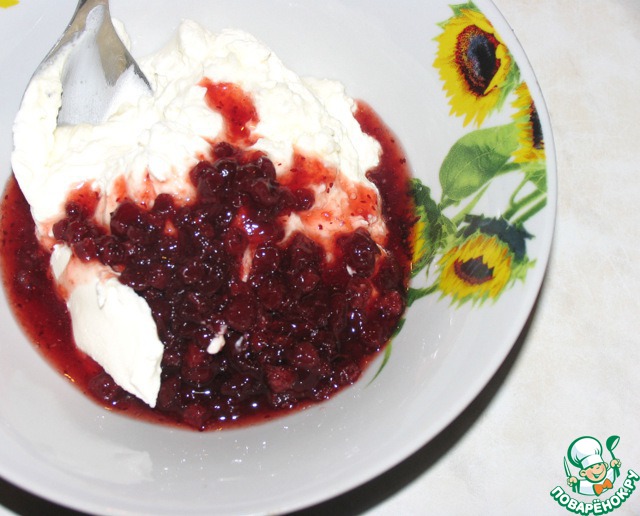 Готовим начинку для налистников. Творог смешать с брусничным соусом.