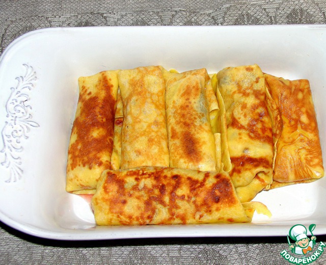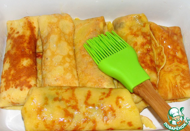 Блин завернула рулетиком ( нижним краем налистника прикрыла начинку, затем загнула оба края с боков и закрутила вверх ). Положила в смазанную маслом форму и верх рулетиков тоже смазала маслом.