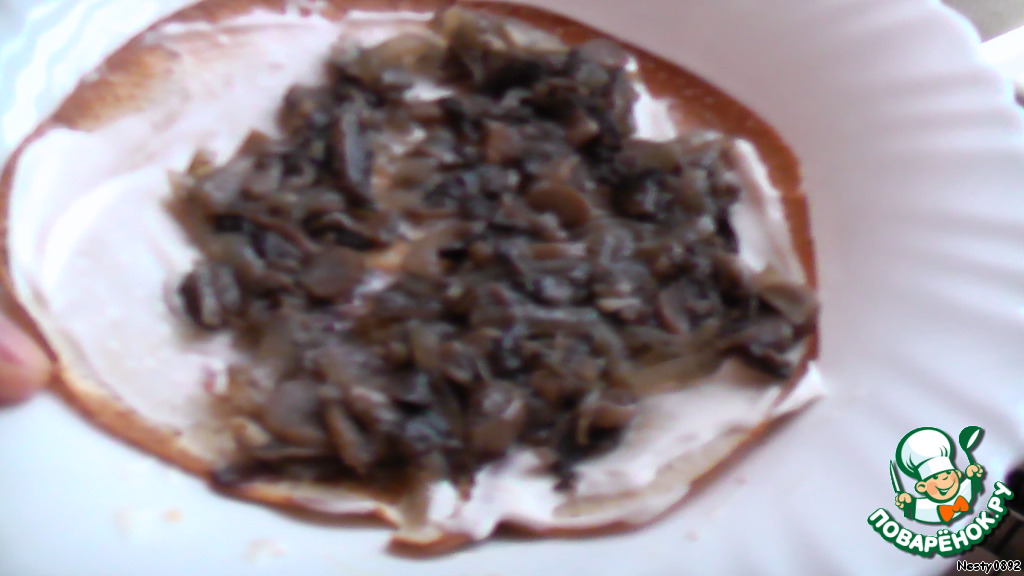 Блинчик промазываем майонезом, далее выкладываем слоями: