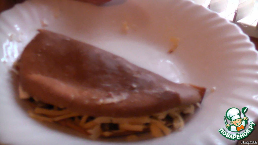 Ставим блинчик в микроволновку на 1 минуту, чтобы расплавился сыр.