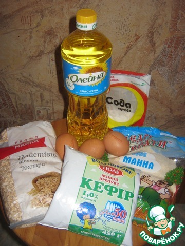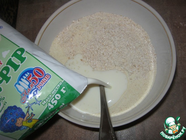Смешать полученную муку с манкой и залить кефиром. Дать настояться часа 1,5