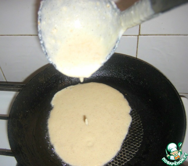 Начинаем печь блины! Я беру полный черпак. Диаметр сковородки 26