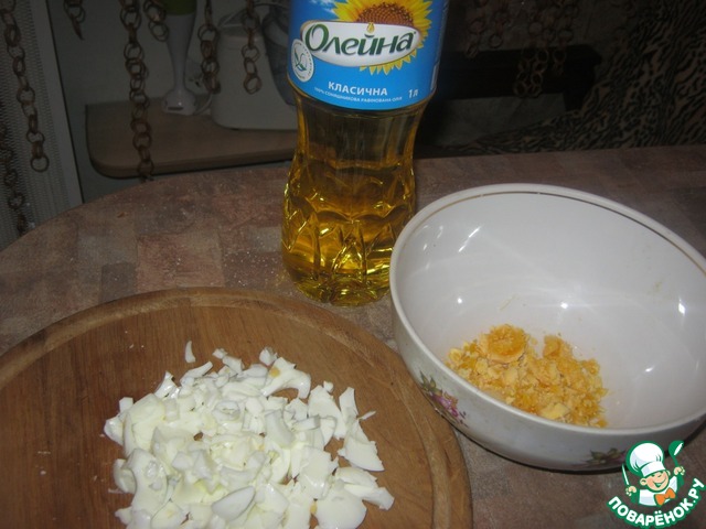 Яйца отварить, отделить белки от желтков. Желтки размять вилкой, белок произвольно покрошить