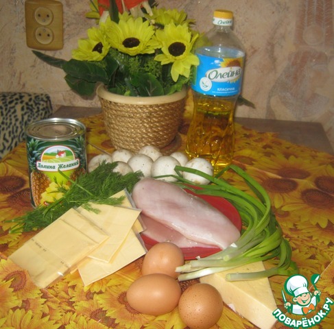 Твёрдый сыр натереть, ананасы измельчить, грибы прожарить в масле ТМ"Олейна".