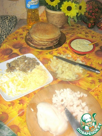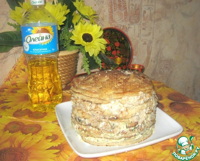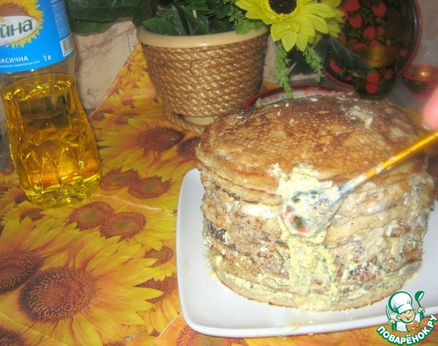 Вот все 7 блинов, соус и начинка собраны в тортик