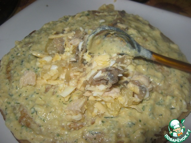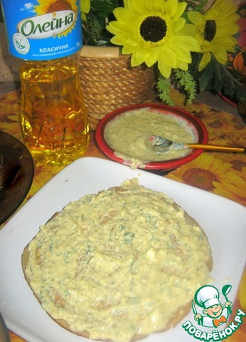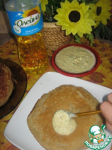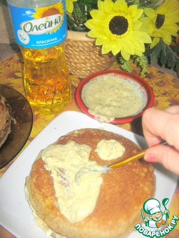 На первый блин намазываем слой соуса "Яичный с маслом ТМ "Олейна"