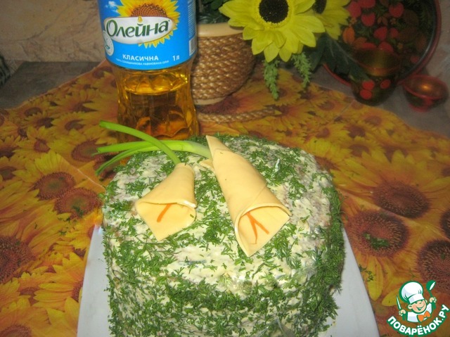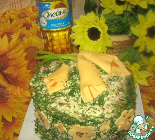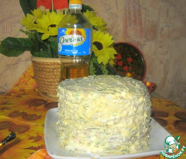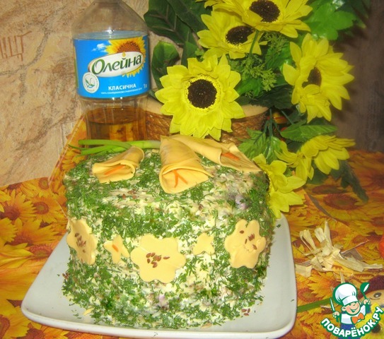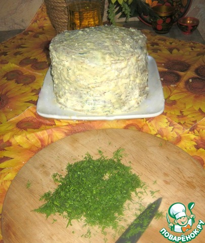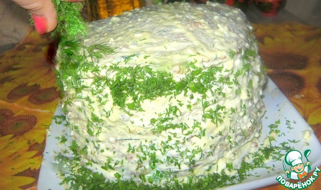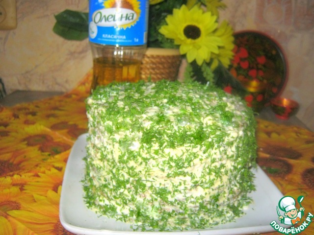 Обсыпаем торт по кругу мелко нарезанным укропом