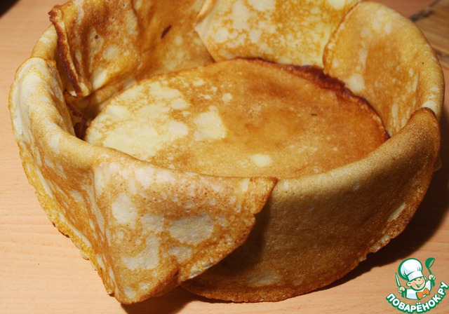Огнеупорную форму смазываем сливочным маслом, блины выкладываем по кругу на стенки формы так, чтобы перекрывали друг друга и края свешивались с борта наружу.