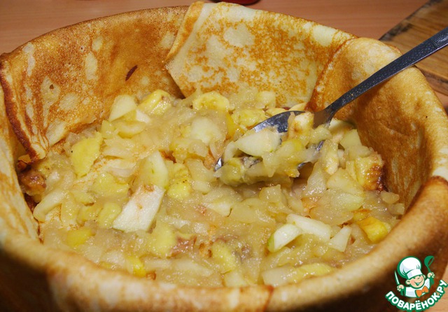 На дно кладем блин, сверху распределяем часть яблочно-банановой начинки, и так, пока не останется один блин: блин - начинка, блин - начинка. Накрываем свисающие края.