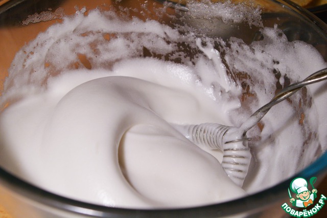 Смазываем белками наш пирог сверху, накрываем блином и выкладываем оставшиеся взбитые белки.