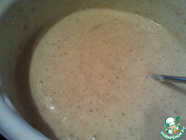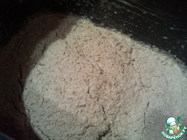 Далее добавляем муку. У меня она не просто ржаная, а еще и цельнозерновая. Так что, вред для талии при праздновании масленицы будет сведен к минимуму!