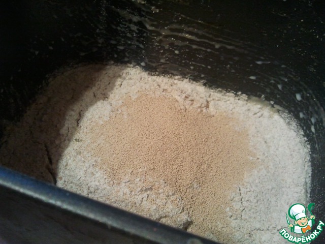 Добавляем дрожжи и вклчаем ХП на режим приготовления дрожжевого теста. Обычно это около 1,5 часа. Кстати, некоторые ХП требуют закладку сначала сухих ингридиентов, потом жидких, а не наоборот, как у меня. Если у Вас таковая, то закладывайте ингредиенты по своей инструкции.