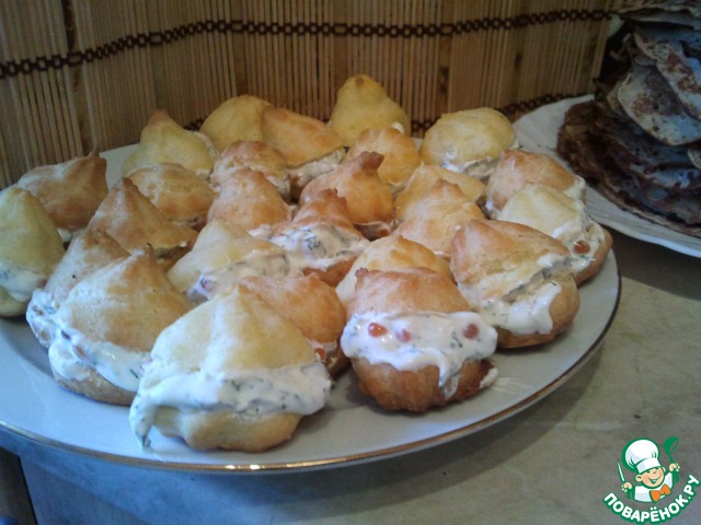 А во-вторых, в перерывах между выпеканием блинов я готовила другие закуски. Например, сырные профитроли с икорным кремом