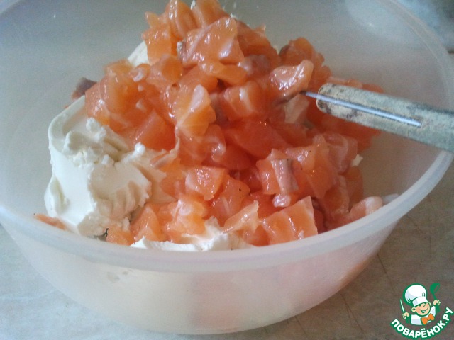 Рыбку режем кубиками, смешиваем с творожным кремом. В идеале - маскарпоне. Но я взяла творожный крем-сыр "Президент". Тоже вкусно.