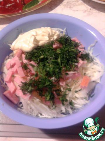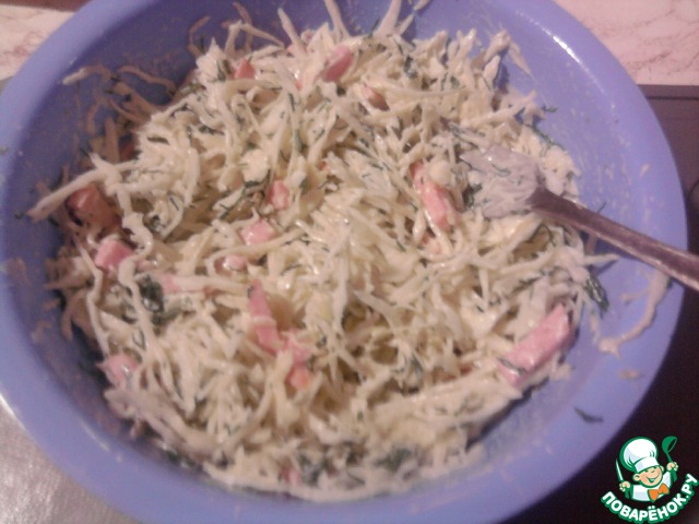Далее приступаем к начинке. Капусту нашинковать. Ветчину нарезать соломкой. Зелень мелко измельчить. Все смешать в глубокой емкости.