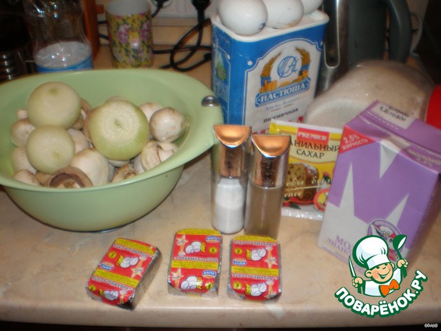 добавить к луку мелко нарезанные шампиньоны. обжарить. снять с огня. добавить плавленые сырки, размешать, чтобы сыр равномерно распределился по начинке.