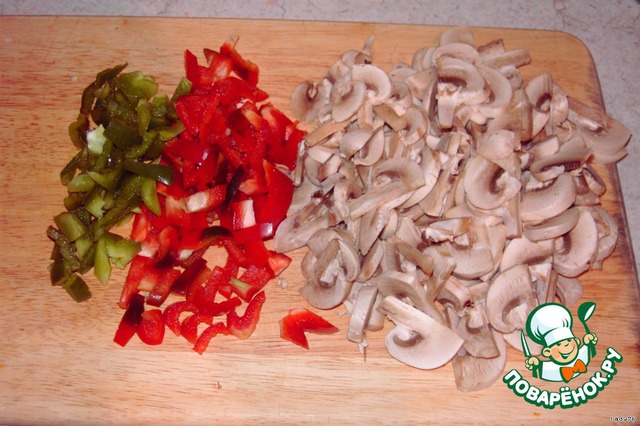 Режем грибы, перец, курицу и 6 пластинок сыра.