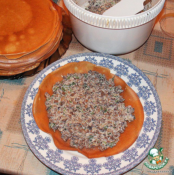 Намазываем на блинчики, сворачиваем как кому нравится – у меня едят рулетиками, потому, что так тесто меньше чувствуется.
