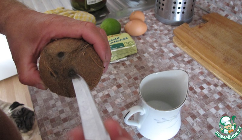На верхушке кокоса выбрать из трех глазков тот, который легко проковырять отверткой или ножом. Выпустить в стакан молочко.