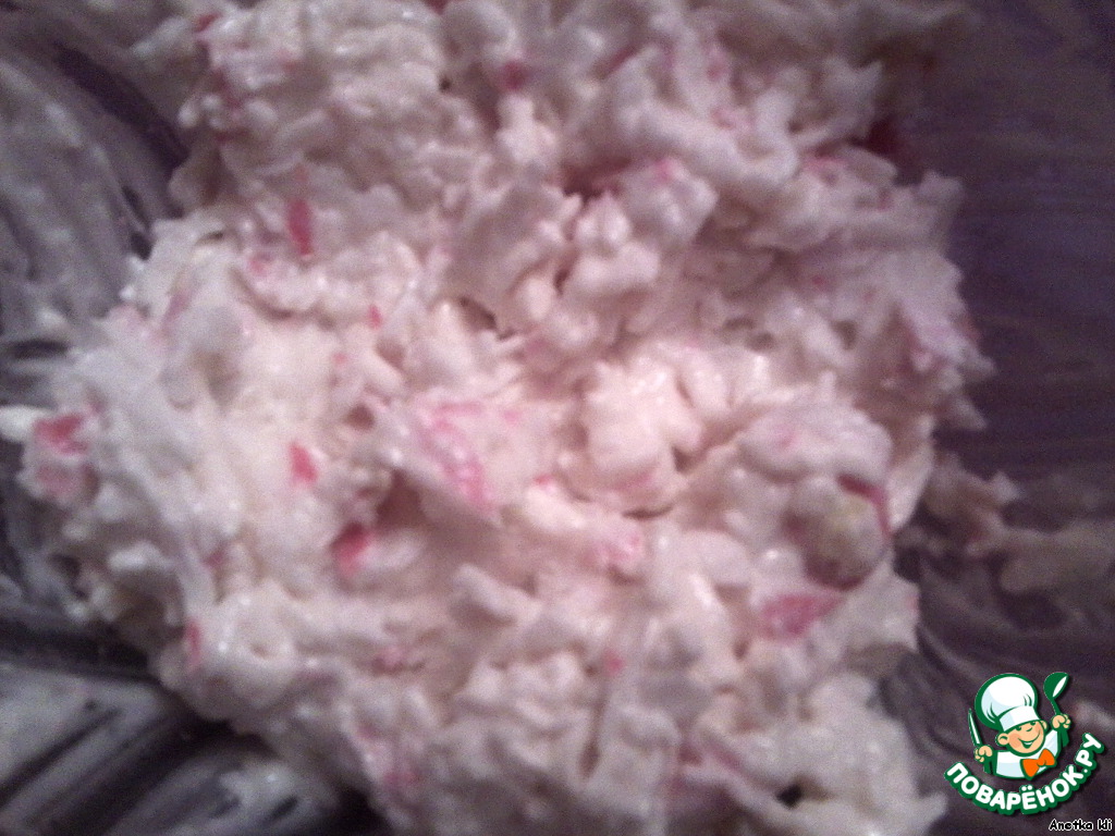 1. Делаем начинку (для заранее испеченных по Вашему любимому рецепту блинчиков): трем на крупной терке плавленый сыр (чтобы сыр легче было натереть, положите его минут на 30 в морозильную камеру) и крабовые палочки (или крабовое мясо). Добавляем чеснок, раздавленный чеснокодавилкой, и майонез. Тщательно перемешиваем. Наша начинка готова.