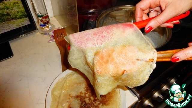 Блины тонкие получаются. А по краям - хрустящие. У меня получилось 15 штук.