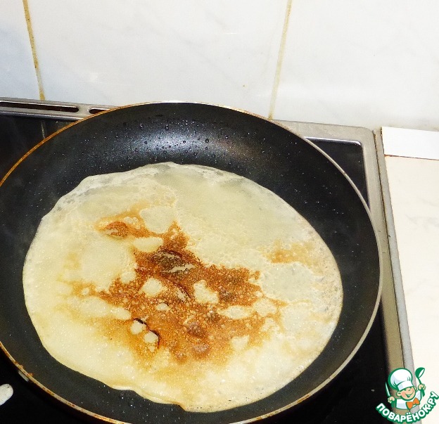 Подглядываем под блин. Он зарумянился, значит его можно переворачивать.