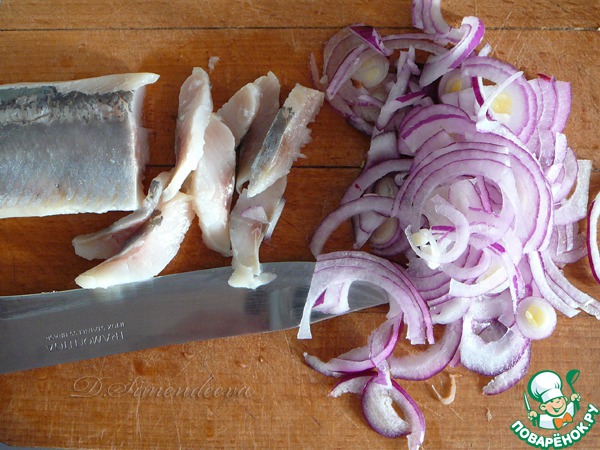 Филе сельди нарезать тонкими ломтиками, лук нарезать полукольцами. Сбрызнуть сельдь и лук лимонным соком, оставить на 5 минут.